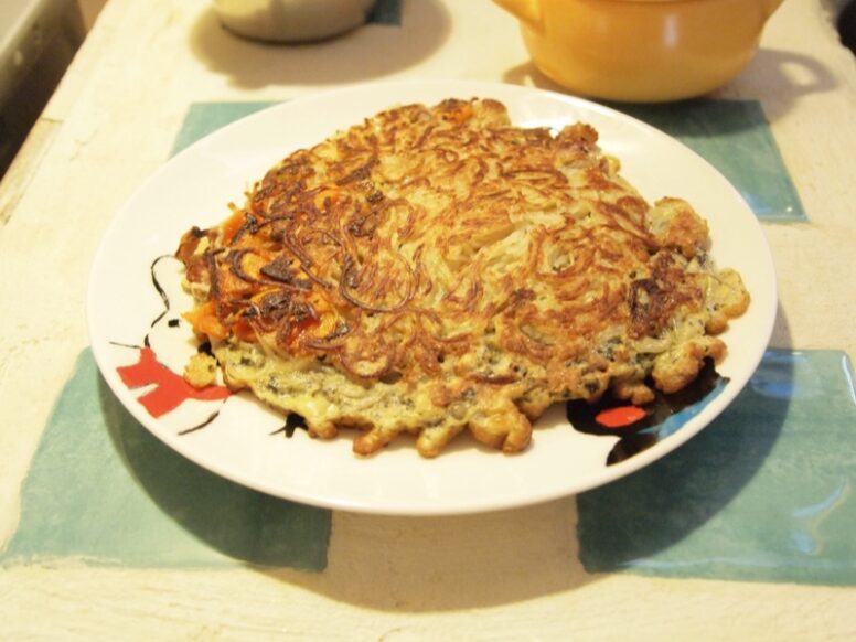 ナガオとベジ太 茶殻とビーフンのお好み焼き。